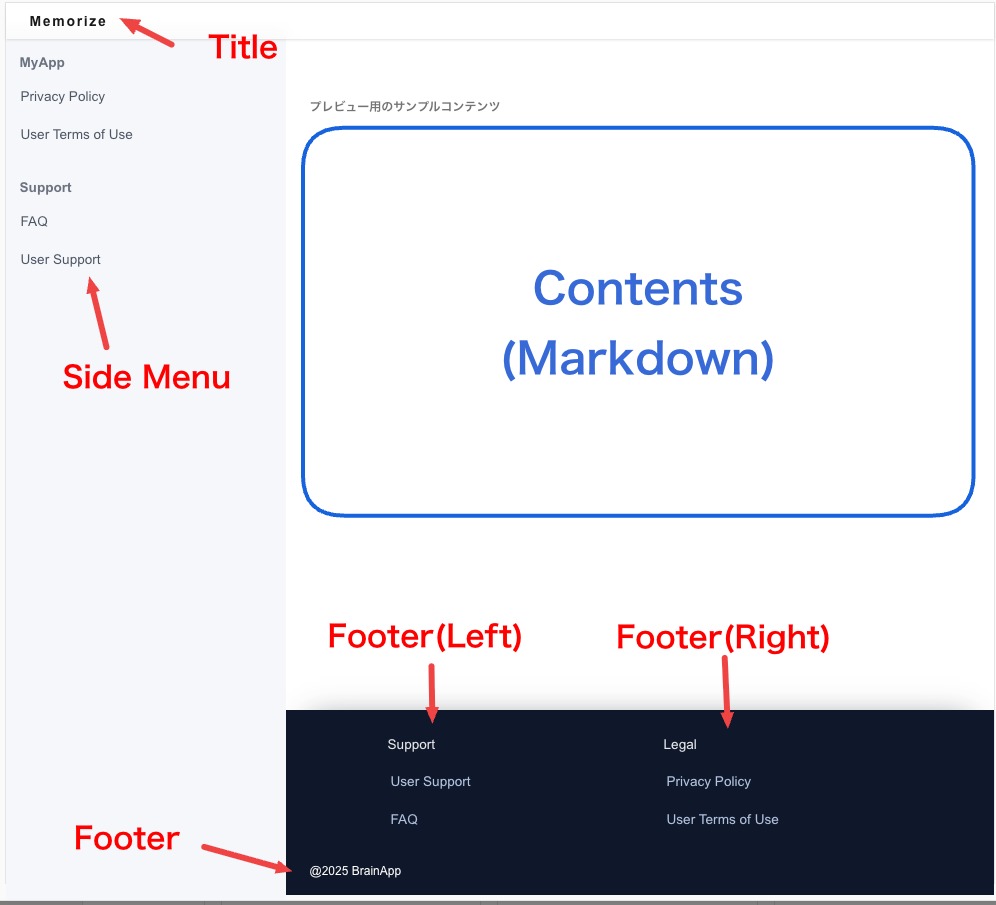 - 赤色テキスト部分は全画面共通のデザインとなります。共通レイアウトメニューで設定できます。