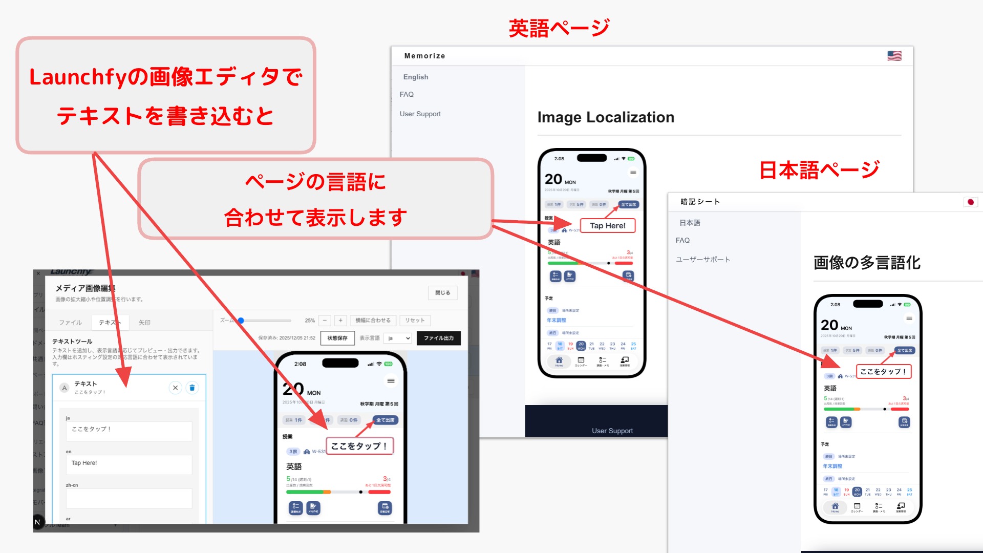 下記サンプルの「ここをタップ!」部分の赤字テキストと矢印は元画像にはなく、本ツールで書き込んでいます。 ここで、日本語の「ここをタップ!」と英語の「Tap Here!」の設定しておくと、各ページの言語に合わせて表示されます。
