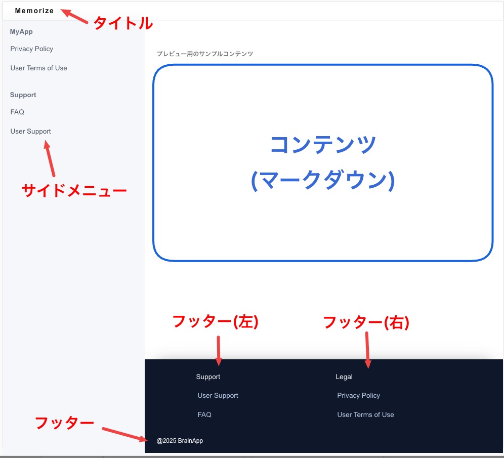 もっと便利な方法として、Launchfyで画像に文字を加え、そのテキストを他言語対応するという方法があります。 このページの画面構成の図がありますが、キャプチャ画像は全言語共通となっており、青字と赤字の部分のみ多言語対応を行っています。画像を複数枚用意する方法と比べて大幅に楽です。
